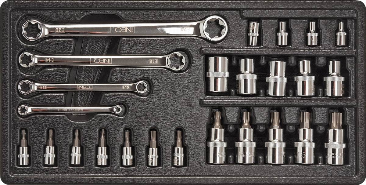 Zestaw narzędzi NEO składa się z 25 elementów. Zestaw zawiera klucze oczkowe Torx, końcówki Torx na nasadce 1/4" i 1/2" oraz końcówki wkrętakowe 1/4" i 1/2". Nasadki wykonane z wysokiej jakości stali chromowo-wanadowej. Wysoką jakość końcówek wkrętakowych zapewnia wykonanie ze stali stopowej S2. Całość dostarczana w wytłoczce z tworzywa, dopasowanej wymiarami do szuflad szafek narzędziowych NEO. Niezawodność produktu potwierdza 25-letnia gwarancja. Marka NEO spełnia oczekiwania profesjonalistów.