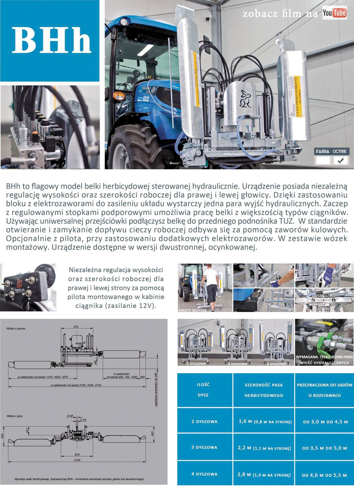 Belka herbicydowa BHh na zderzak lub podnośnik z hydraulicznym składaniem, rozkładaniem oraz regulacją szerokości i wysokości roboczej- niezależnie dla prawej i lewej strony głowicy roboczej.