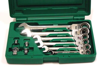 Jonnesway zestaw kluczy płasko-oczkowych z grzechotką przegubowych z adapterami 10szt