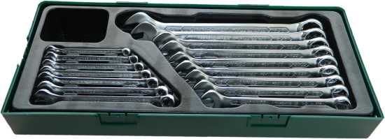 Klucze płasko oczkowe SUPER TECH marki Jonnesway odkręcają śruby / nakrętki metryczne, calowe, E-TORX, 6 kątne, 12 kątne, trójkątne i kwadratowe. Technologia innych punktów podparcia i nacisku części oczkowej klucza. Zestaw obejmuje 16 sztuk.
