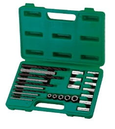 Zestaw umożliwia wykręcenie urwanych śrub i szpilek w rozmiarach od M5 do M16 niezależnie od tego czy pozostały element wystaje ponad powierzchnię, czy też znajduje się wewnątrz otworu. Dzięki zastosowaniu tulei prowadzących możliwe jest dokładne wycentrowanie wiertła i trzpienia wykręcającego a co eliminuje ryzyko uszkodzenia elementów.