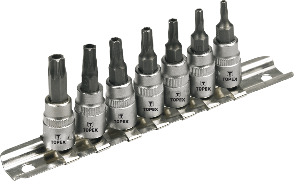 Końcówki Torx na nasadce TOPEX o rozmiarze gniazda 1/4”. Wszystkie elementy wykonane z wytrzymałej stali chromowo-wanadowej, zapewniającej długą żywotność produktu. Marka TOPEX skierowana jest do majsterkowiczów