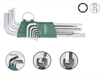 Zawartość: 9 kluczy o rozmiarach: 1,5; 2; 2,5; 3; 4; 5; 6; 8; 10mm Materiał: S2. Specjalne nacięcia rowkowe na częściach roboczych kluczy umożliwiają odkręcanie śrub z gniazdami wyrobionymi.