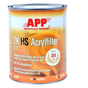 Dwuskładnikowy podkład wypełniającym posiadający doskonałą przyczepność do szpachli poliestrowych i starych powłok lakierniczych. Receptura gwarantuje bardzo dobrą przyczepność do stali, stali ocynkowanej i aluminium oraz podwyższone własności antykorozyjne. Wysoka zawartość substancji stałych (High Solid) umożliwia nakładanie grubych warstw bez ryzyka "płynięcia" powłoki. APP 2K HS Acrylfiller 4:1 jest podkładem o niskiej zawartości cząstek organicznych VOC < 540 g/l i podwyższonych własnościach kryjących. Jest przeznaczony do podkładowania metodą klasyczną ze szlifowaniem oraz do pracy w systemie 'mokro na mokro'