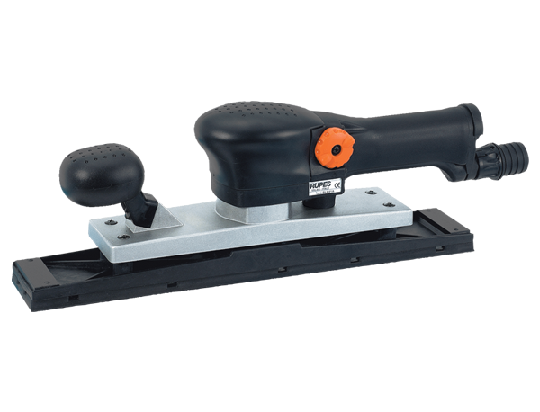 Idealna do szlifowania i wyrównywania dużych płaskich powierzchni. Jest zaopatrzona w gumową lub rzepową płytę roboczą z otworami do układu wyciągowego. Dane techniczne: ciśnienie robocze 6 bar, zużycie powietrza 400 l/min; ilość obrotów 4000-10000 RPM; skok 4,8mm. Płyta robocza 400mm x 70mm.