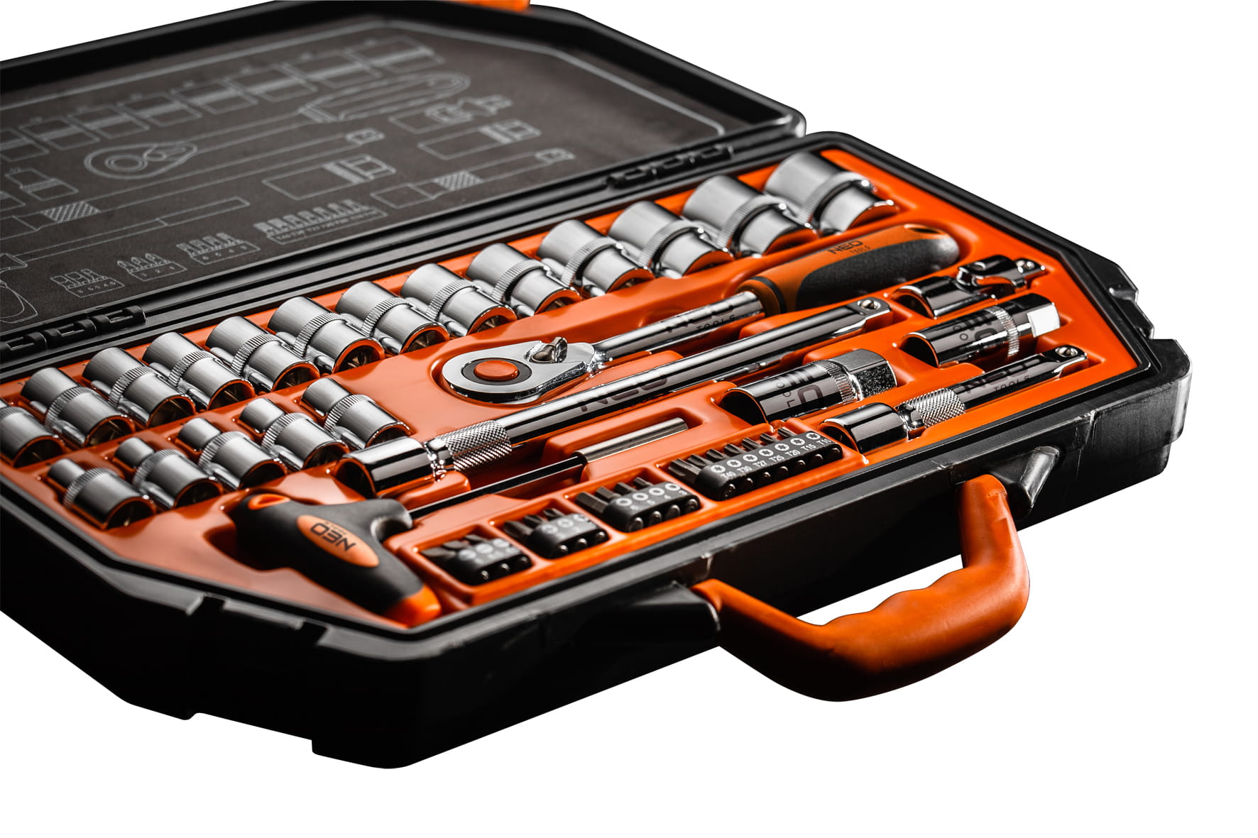 Zestaw kluczy nasadowych 1/2" NEO składa się z 42 elementów, wykonanych z wysokiej jakości stali chromowo-wanadowej. W skład zestawu wchodzi grzechotka, wyposażona w trwały mechanizm zapadkowy (48 zębów). Zestaw zawiera bogaty pakiet nasadek (w rozmiarach od 8 do 32 mm), nasadek do świec i końcówek wkrętakowych (płaskie, krzyżowe, sześciokątne, Torx z otworem). Uzupełnieniem są poręczny uchwyt wkrętakowy "T", przedłużki i przegub uniwersalny. Całość dostarczona jest w praktycznej walizce. Jakość narzędzia potwierdzona certyfikatem TÜV i 25-letnią gwarancją producenta. Marka NEO spełnia oczekiwania profesjonalistów.