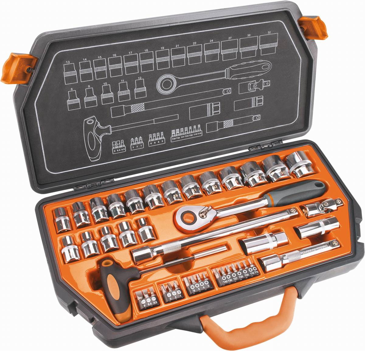 Klucze nasadowe 1/2, zestaw 42 szt., grzechotka 245 mm, 48 zębów, przełącznik kierunku obrotów, uchwyt wkrętakowy typu T 175 mm, przegub uniwersalny 65 mm, 2 szt. przedłużek 125, 250 mm, 2 szt. nasadek do świec, rozmiary: 16, 21 mm, 18 szt. nasadek sześciokątnych, rozmiary: 8, 9, 10, 11, 12, 13, 14, 15, 16, 17, 18, 19, 21, 22, 24, 27, 30, 32 mm, 17 szt. końcówek wkrętakowych 25 mm, rozmiary: płaskie 4.5, 6.5, 8 mm, krzyżowe PH1, PH2, PH3, sześciokątne H3, H4, H5, H6, Torx z otworem TT10, TT15, TT20, TT25, TT27, TT30, TT40, stal CrV, końcówki wkrętakowe stal S2, walizka z tworzywa