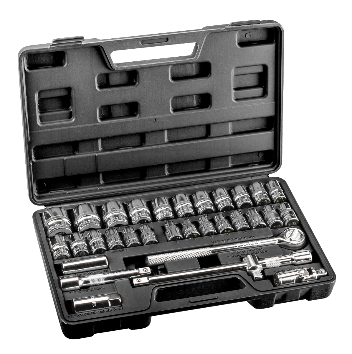 Klucze nasadowe 1/2", kpl. 32 szt., nasadki sześciokątne: 8, 9, 10, 11, 12, 13, 14, 15, 16, 17, 18, 19, 21, 22, 24, 27 mm, nasadki dwunastokątne: 10, 12,14, 15, 17, 19 mm, przedłużka 125 i 250 mm z przetyczką, grzechotka 24 zęby, nasadki długie: 13, 17, 19 mm, nasadki do świec 16 i 21 mm, przegub uniwersalne