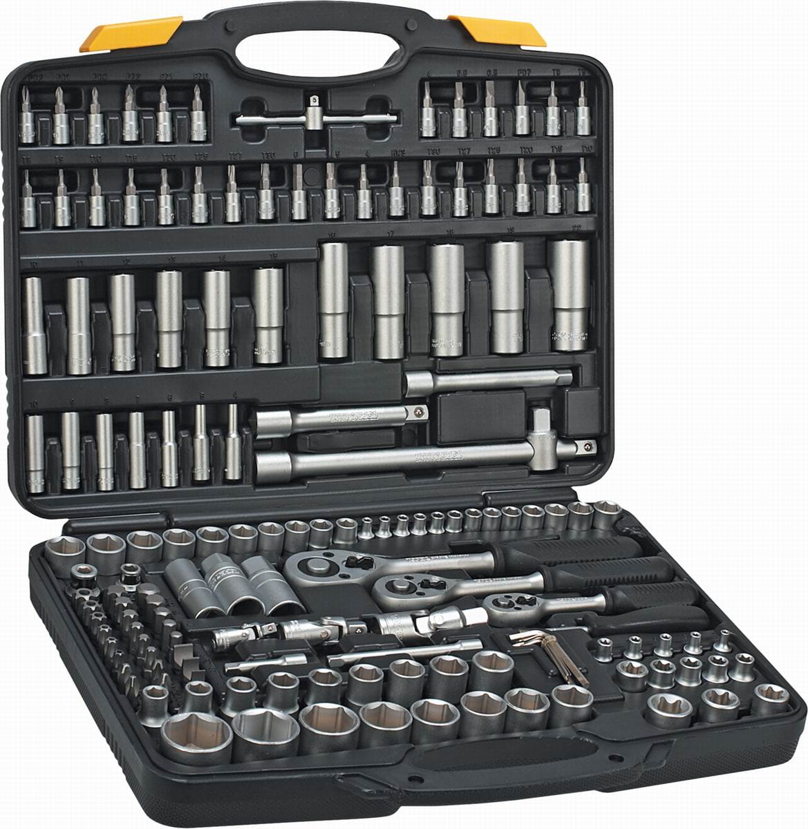 Klucze nasadowe 1/4, 3/8, 1/2, zestaw 150 szt., 1/4: grzechotka 150 mm, 24 zęby, przełącznik kierunku obrotów, 2 szt. przedłużek 50, 100 mm, przegub uniwersalny 40 mm, pokrętło z zabierakiem 110 mm, 2 szt. adapteru do końcówek wkrętakowych 1/2- 8 mm, 3/8- 8 mm, uchwyt wkrętakowy do końcówek 150 mm, 13 szt. nasadek sześciokątnych krótkich, rozmiary: 4, 4.5, 5, 5.5, 6, 7, 8, 9, 10, 11, 12, 13, 14 mm, 8 szt. nasadek sześciokątnych długich, rozmiary: 4, 5, 6, 7, 8, 9, 10 mm, 5 szt. nasadek Torx, rozmiary E4, E5, E6, E7, E8, 30 szt. końcówek wkrętakowych na nasadce 40 mm, rozmiary: płaskie 4, 5.5, 6.5, 7 mm, krzyżowe PH0, PH1, PH2, PZ0, PZ1, PZ2, sześciokątne H3, H4, H5, H6, Torx T8, T9, T10, T15, T20, T25, T27, T30, Torx z otworem TT8, TT9, TT10, TT15, TT20, TT25, TT27, TT30, 24 szt. końcówek wkrętakowych 30 mm, rozmiary: płaskie 8, 10, 12 mm, krzyżowe PH3, PH4, PZ3, PZ4, sześciokątne H7, H8, H10, H12, H14, Torx T40, T45, T50, T55, T60, T70, Torx z otworem TT40, TT45, TT50, TT55, TT60, TT70, 3/8: grzechotka 210 mm, 24 zęby, przełącznik kierunku obrotów, przedłużka 125 mm, przegub uniwersalny 55 mm, 10 szt. nasadek sześciokątnych krótkich, rozmiary: 10, 11, 12, 13, 14, 15, 16, 17, 18, 19 mm, 6 szt. nasadek sześciokątnych długich, rozmiary: 10, 11, 12, 13, 14, 15 mm, 6 szt. nasadek Torx, rozmiary E10, E11, E12, E14, E16, E18, 1/2: grzechotka 250 mm, 24 zęby, przełącznik kierunku obrotów, przegub uniwersalny 75 mm, 2 szt. przedłużek 125, 250 mm, pokrętło z zabierakiem 250 mm, redukcja 1/2M x 3/8F, 3 szt. nasadek do świec, rozmiary 16, 18, 21 mm, 17 szt. nasadek sześciokątnych, rozmiary: 10, 11, 12, 13, 14, 15, 16, 17, 18, 19, 20, 21, 22, 24, 27, 30, 32 mm, 5 szt. nasadek sześciokątnych długich: 16, 17, 18, 19, 22 mm, 2 szt. nasadek Torx, rozmiary: E20, E24, 7 szt. kluczy sześciokatnych, rozmiary: 1.2, 1.5, 2, 2.5, 3, 4, 5 mm, stal CrV, walizka z tworzywa