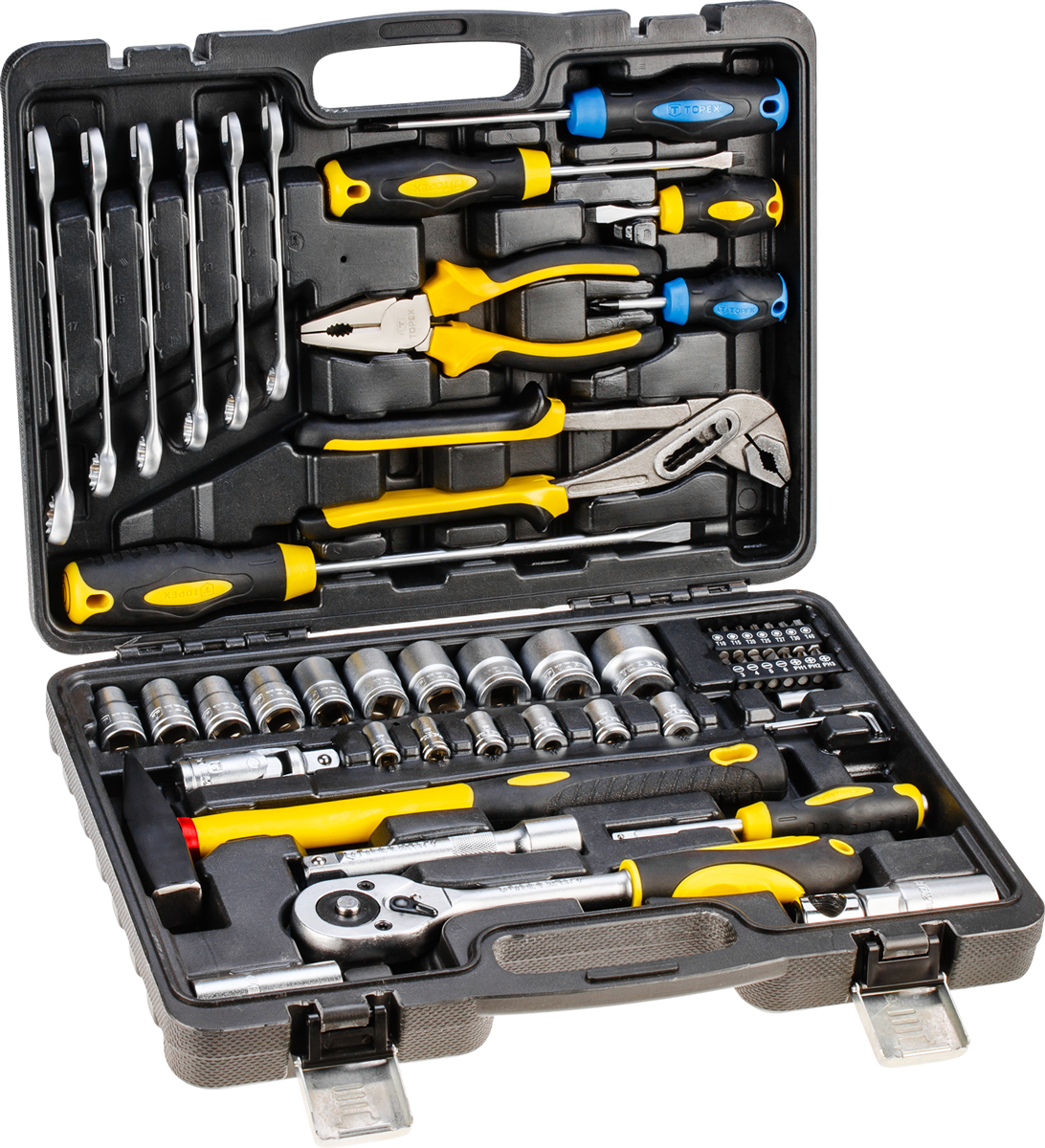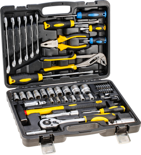 Zestaw narzędzi 56 szt. klucze płasko - oczkowe: 8, 10, 12, 13, 15, 17 mm, wkrętaki: PH2 x 38 mm, PH2 x 100 mm, płaski 5.5 x 100 mm, PH2 x 200 mm, płaski 5.5 x 38 mm, szczypce uniwersalne 160 mm, szczypce do rur 8", grzechotka 1/2", nasadki 1/2": 8, 10, 13, 15, 17, 19, 22, 24, 27, 30 mm, uchwyt pokrętło do bitów i bitów na nasadkach 1/4", bity na nasadkach 1/4" - 7 szt., 14 bitów 1/4": płaskie, PH, PZ, Torx, 4 klucze sześciokątne, przegub uniwersalny 1/4", nasadka do świec 16 mm, przedłużna 1/2" x 100 mm, młotek 400 g