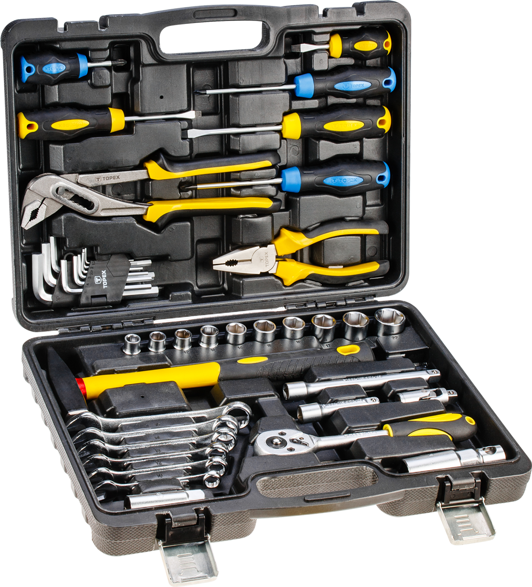 Zestaw narzędzi 41 szt. klucze płasko-oczkowe: 8, 10, 12, 13, 15, 17 mm, wkrętaki: PH2 x 38 mm, PH2 x 100 mm, płaski 5.5 x 100 mm, PH2 x 200 mm, płaski 5.5 x 38 mm, szczypce uniwersalne 160 mm, szczypce do rur 8", grzechotka 1/2", nasadki 1/2": 8, 10, 13, 15, 17, 19, 22, 24, 27, 30 mm, klucze sześciokątne 9 szt., przegub uniwersalny 1/4", nasadka do świec 16 mm, przedłużna 1/2" x 100 mm, młotek 400 g